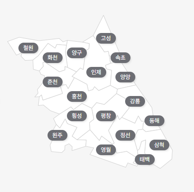 | (강원) 철원, 화천, 양구, 고성, 인제, 속초, 양양, 춘천, 홍천, 횡성, 원주, 평창, 영월, 정선, 태백, 삼척, 동해, 강릉 |