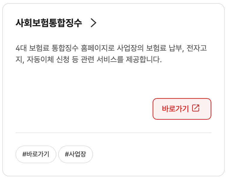 또한 사업장 적용 통보서, 사회보험통합징수, EDI 서비스, 요양기관정보마당, 사업장 증명서 진위확인, 사업장직원 조회, 보험료 환급금 조회 및 신청 등도 할 수 있습니다. 아래의 이미지를 선택하면, "건강보험공단 홈페이지"로 바로 이동합니다.