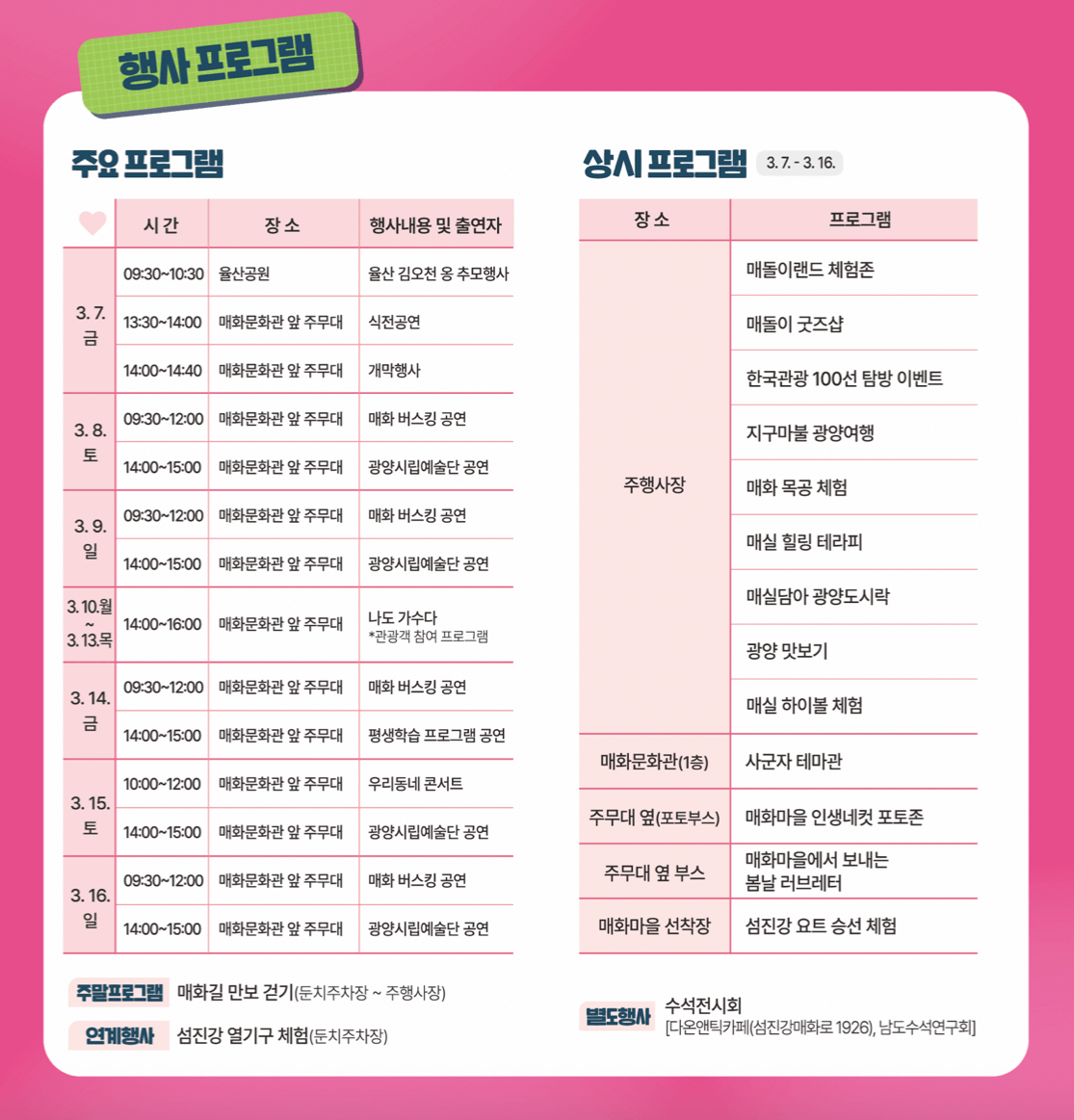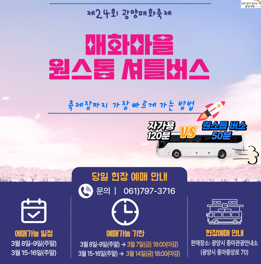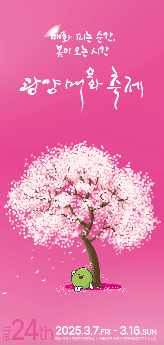 제 24회 광양 매화축제 기간은 2025년 3월 7일 ~ 3월 16일까지 10일 동안입니다. 광양 매화축제 장소는 다압면 매화마을 일원입니다. 광양 매화축제 입장료는 성인 5,000원, 청소년 4,000원이며, 상품권으로 전액 환급을 받습니다.