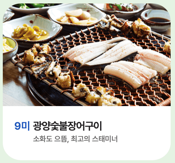 | 그러소 / 광양불고기, 육회 | 갯마을장어구이 / 장어구이 | 소낭구 / 닭숯불구이 |