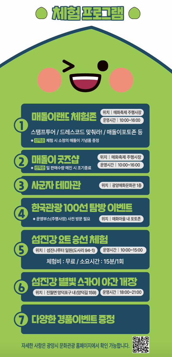 광양 매화축제 홈페이지 통해서 매화축제 안내도, 주행사장 배치도, 셔틀버스 안내, 매표소 안내, 행사프로그램, 체험프로그램 등에 대한 정보를 확인하실 수 있습니다. 아래의 이미지를 선택하면, "광양 매화축제 홈페이지"로 바로 이동합니다.