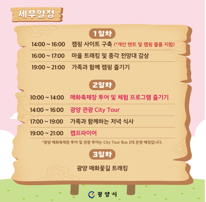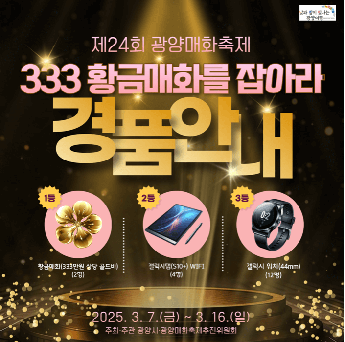 광양 매화축제기간 2025년 3월 7일부터 3월 16일까지입니다. 광양 매화축제 입장료는 성인 5,000원, 청소년 4,000원이지만, 상품권으로 환급을 받습니다. 광양 매화축제 홈페이지 통해서 주차장 정보, 셔틀버스 정보, 프로그램 정보 등도 확인 가능합니다.