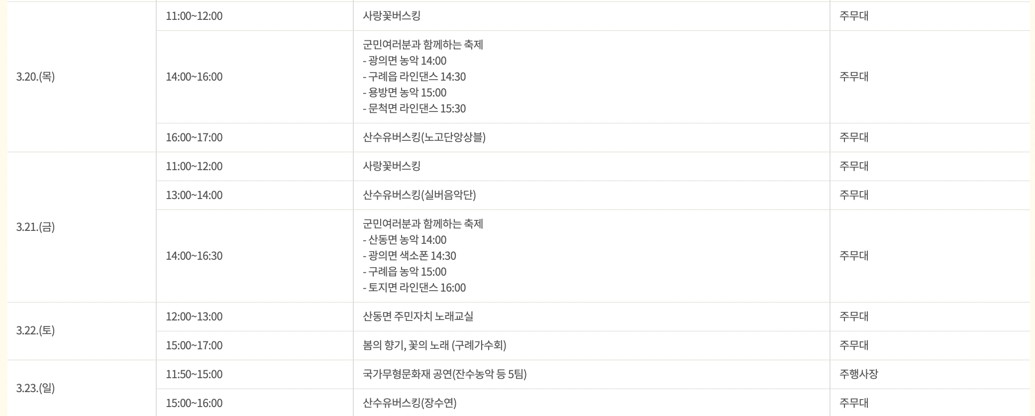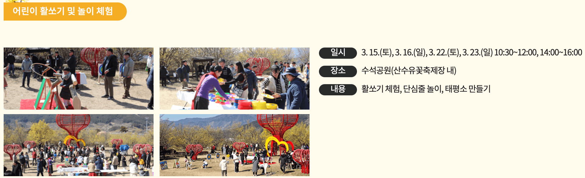 구례 산수유꽃축제 기간은 2025년 3월 15일 ~ 3월 23일까지입니다. 장소는 전남 구례군 지리산온천 관광지 일원입니다. 이번 주행사장 출연가수는 임창정, 나태주, 장예주, 이정옥입니다.