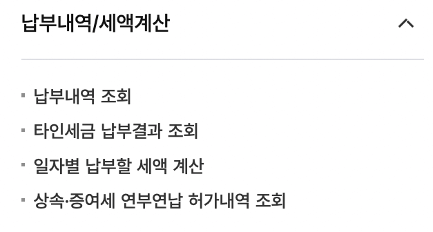 | 부가가치세 세액비교 | 중간예납 고지 세액 조회 | 신고안내 양도자산 내역 조회 | 종교인소득 간이세액표 |