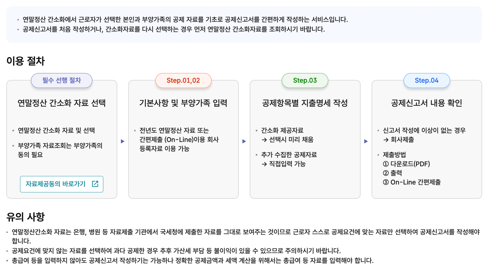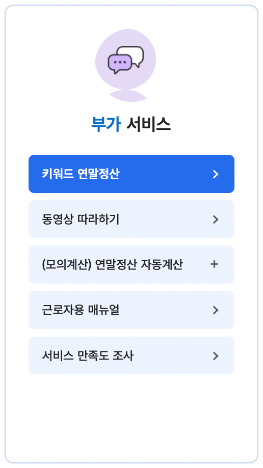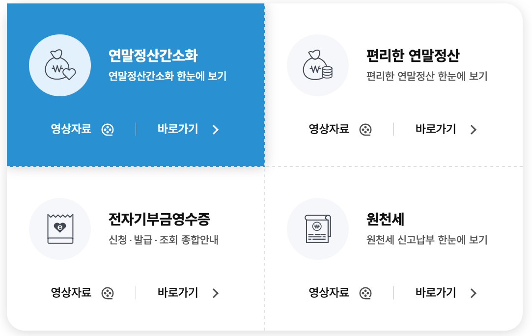 | 계산서/영수증/카드 | 증명/등록/신청 | 지급명세/자료/공익 | 납부/고지/환급 | 장려금/연말정산/기부금 |