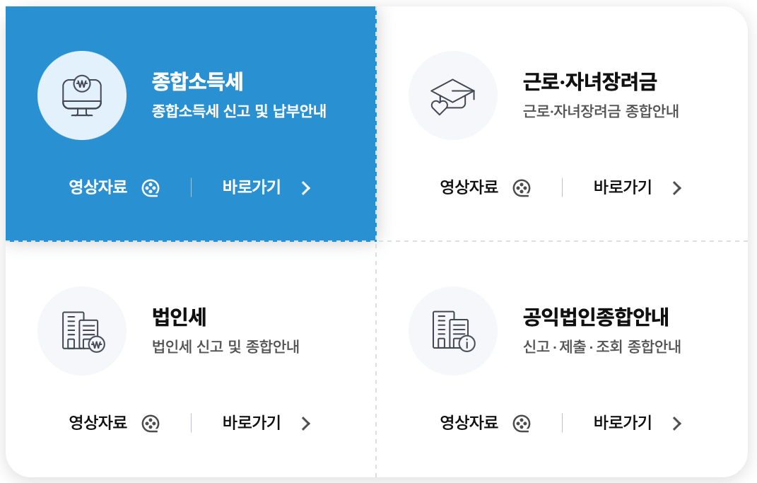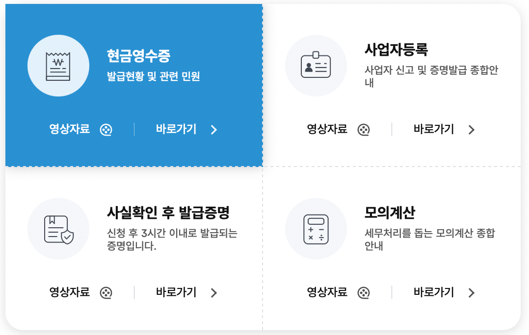 국세청 홈택스 홈페이지 통해서 전자세금계산서 발급, 현금영수증 조회, 사업자 신용카드 등록, 사업자등록증 발급, 종합소득세 신고, 부가가치세 신고, 세금납부, 국세환급, 소득자료 제출, 근로장려금 신청, 연말정산간소화, 기부금영수증 등에 대한 업무를 하실 수 있습니다.
