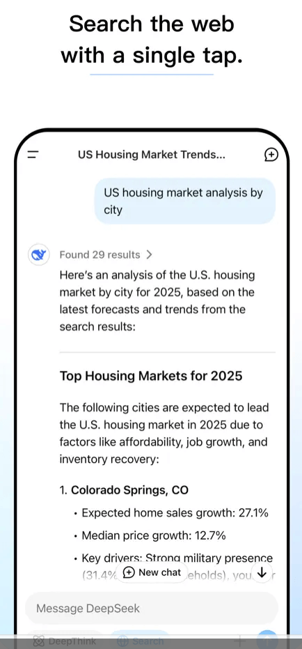 | (1) 직관적인 채팅 인터페이스 (딥시크 AI와 자연스럽고 텍스트 기반 대화) |