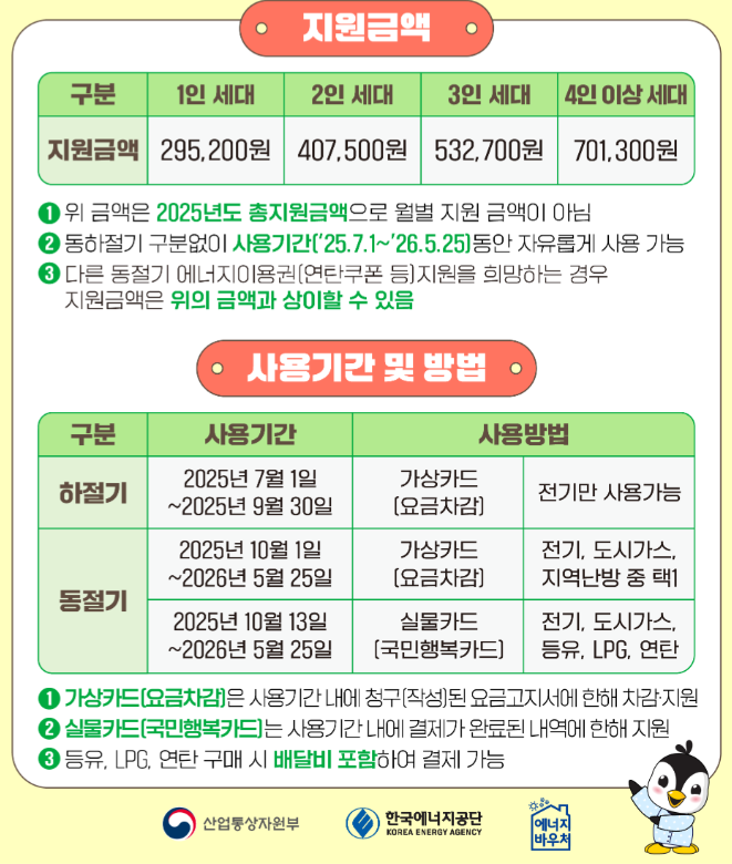 에너지바우처 지원금액은 세대 인원에 따라 금액이 다릅니다. 아래 표로 나오는 금액은 2025년도 총 지원금액으로 월별 지원 금액이 아닙니다. 동하절기 구분없이 사용기간은 2025년 7월 1일부터 2026년 5월 25일까지입니다.