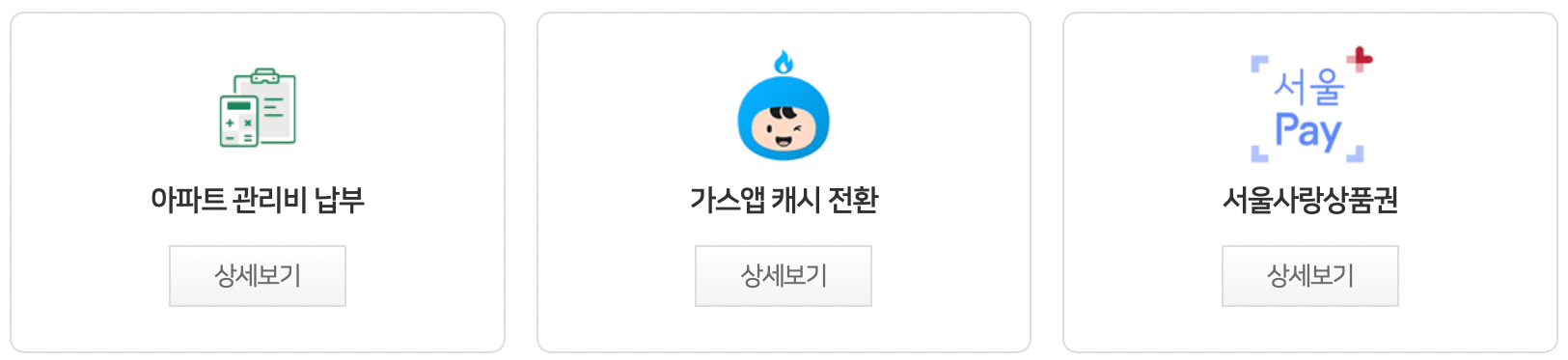 | 아파트 관리부 납부 | 가스앱 캐시 전환 | 서울사랑상품권 |