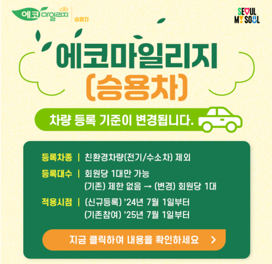에코마일리지 통해서 서울시 내 가정이나 사업장에서 전기 수도 도시가스 에너지를 절약한 정도에 따라 마일리지가 지급됩니다. 승용차 마일리지는 서울시에 등록된 자동차의 주행거리 감축 정도에 따라 마일리지가 지급됩니다. 아래의 이미지를 선택하면, "에코마일리지 홈페이지"로 바로 이동합니다.