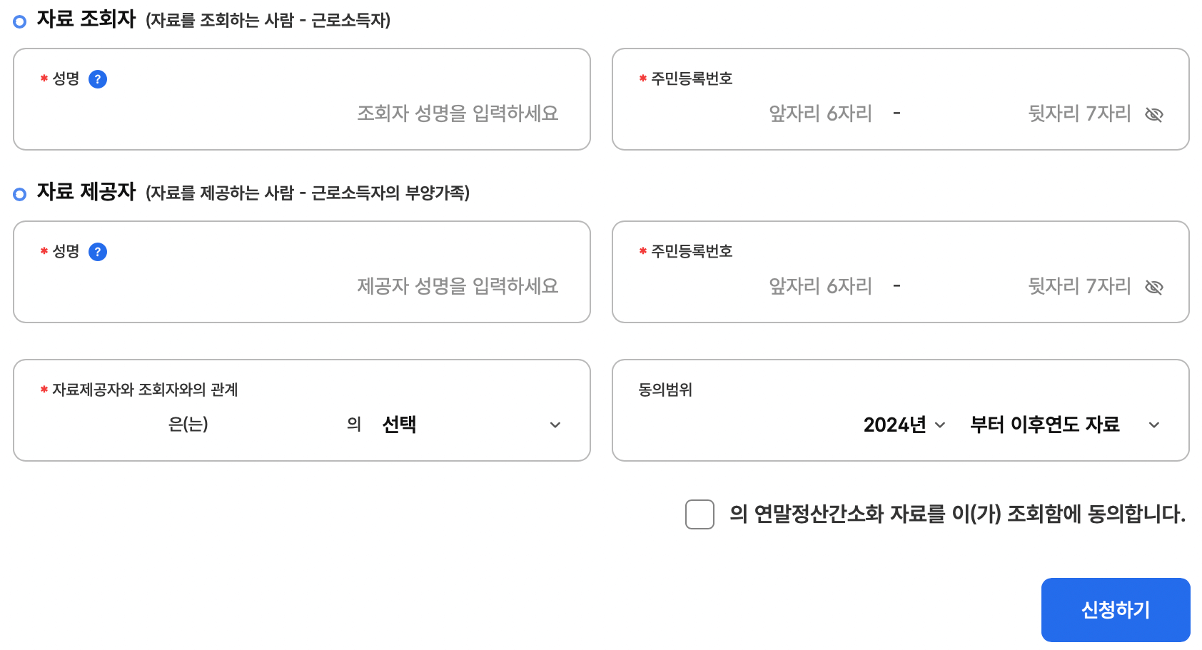 2024년 귀속 연말정산 간소화서비스 자료 확인, 공제신고서 제출, 원천징수영수증 발급 등 기간 내에 조회 신청을 하시길 바랍니다.