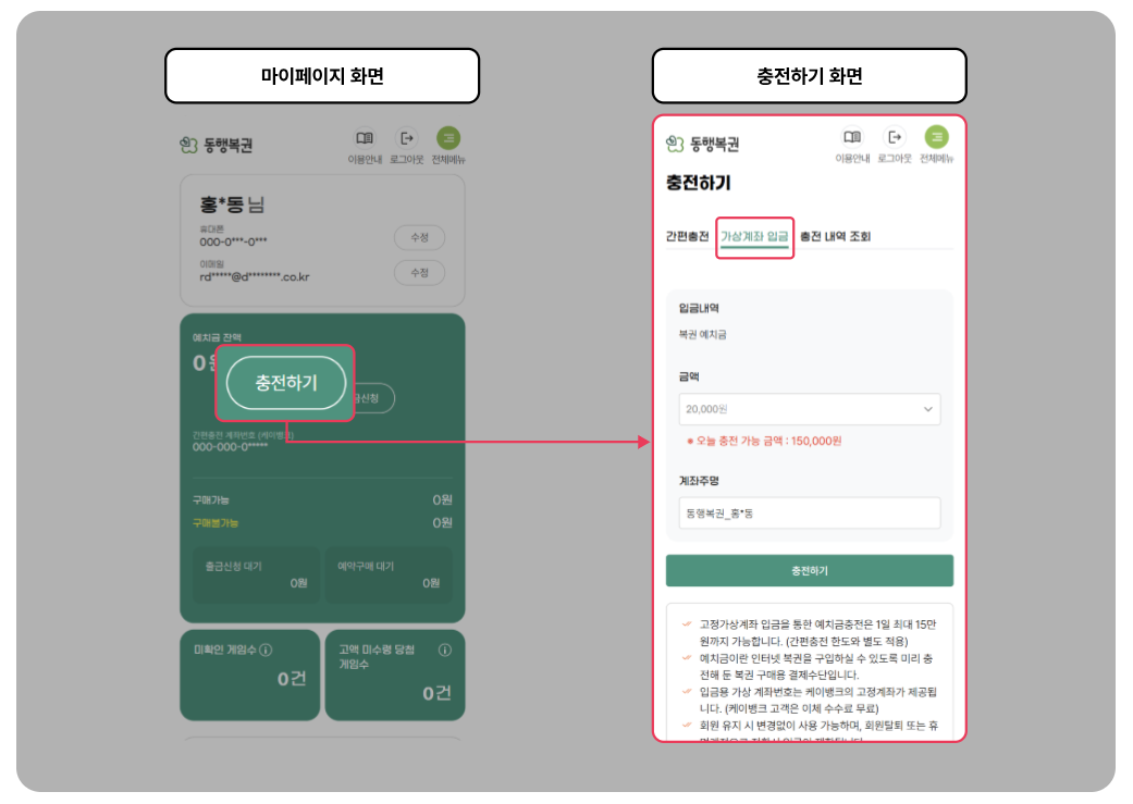 마이페이지 → [충전하기] → 가상계좌 입금