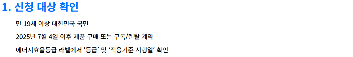 으뜸효율 환급사업 신청대상은 만 19세 이상 대한민국 국민으로 2025년 7월 4일 이후 구입 또는 구독렌트한 제품으로 에너지효율등급 라벨에서 '등급' 및 '적용기준 시행일'이 맞아야 합니다. 아래의 내용을 확인하시고 서류 등을 준비해서 신청해 보시길 바랍니다.