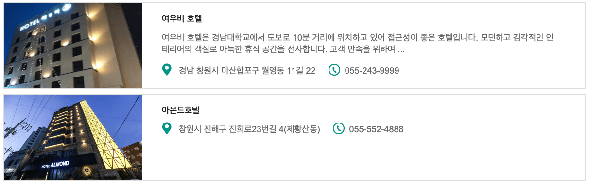 | 크라운호텔 창원 | 창원시 창원대로 363번길 22-5 | 055-237-1001 |
