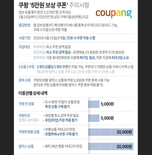 요즘 가장 말 많은 이슈 중 하나가 바로 쿠팡 5만원 보상이다. 현금으로 준다는 소문에 기대했다가 실망한 사람도 있고, “이 정도면 괜찮다”는 반응도 적지 않다. 하지만 온라인에 떠도는 정보가 제각각이라 정확한 내용이 헷갈리는 게 사실이다. 그래서 개인정보 유출에 따른 쿠팡 5만원 보상 내용을 핵심만 정리해봤다.