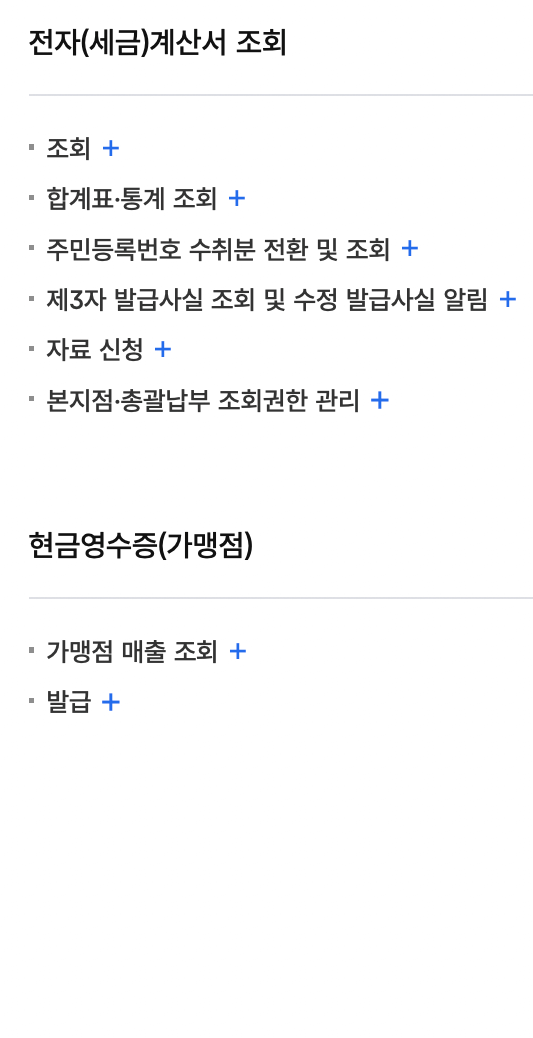 | 전자세금계산서 발급 | 전자세금계산서 조회 | 현금영수증(근로자/소비자) |