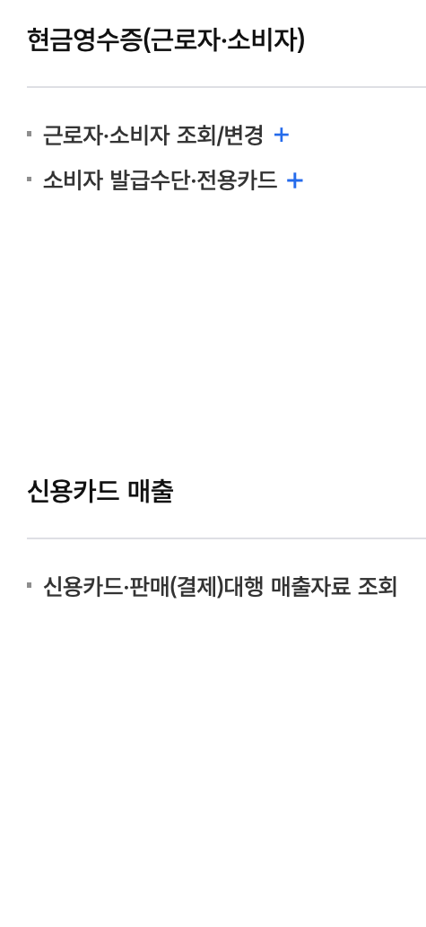 | 현금영수증(매입/지출증빙) | 현금영수증(가맹점) | 신용카드 매출 / 신용카드 매입 |