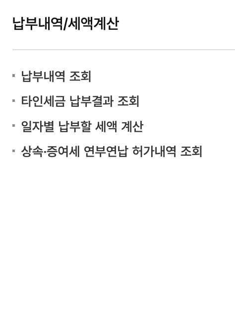 | 세금납부 | 납부내역/세액계산 |