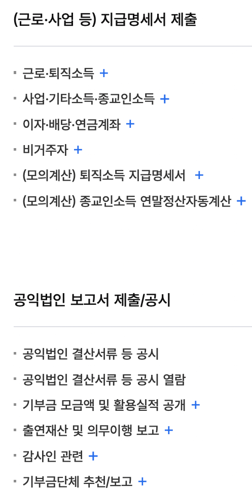 | 과세자료 조회/삭제 | 공익법인 보고서 제출/공시 |