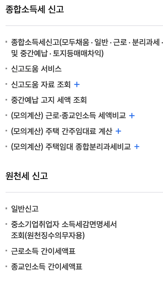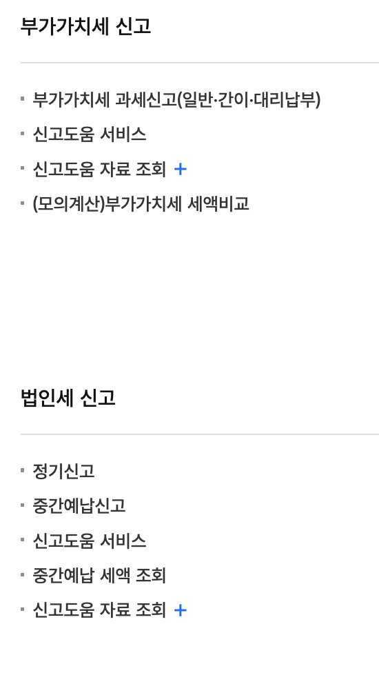 | 부가가치세 신고 | 종합소득세 신고 | 양도소득세 신고 | 법인세 신고 |